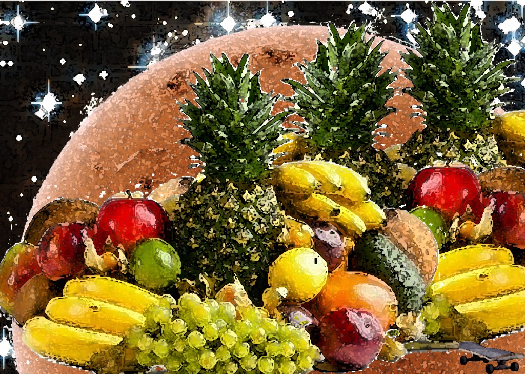 SHORT STORY #2 Chapter Heading Pic – The sun, the stars, a whole lot of ginormous fruit, and a minuscule skateboard – that basically gives you the intro/entree to story #2 Still Life With Skateboard.