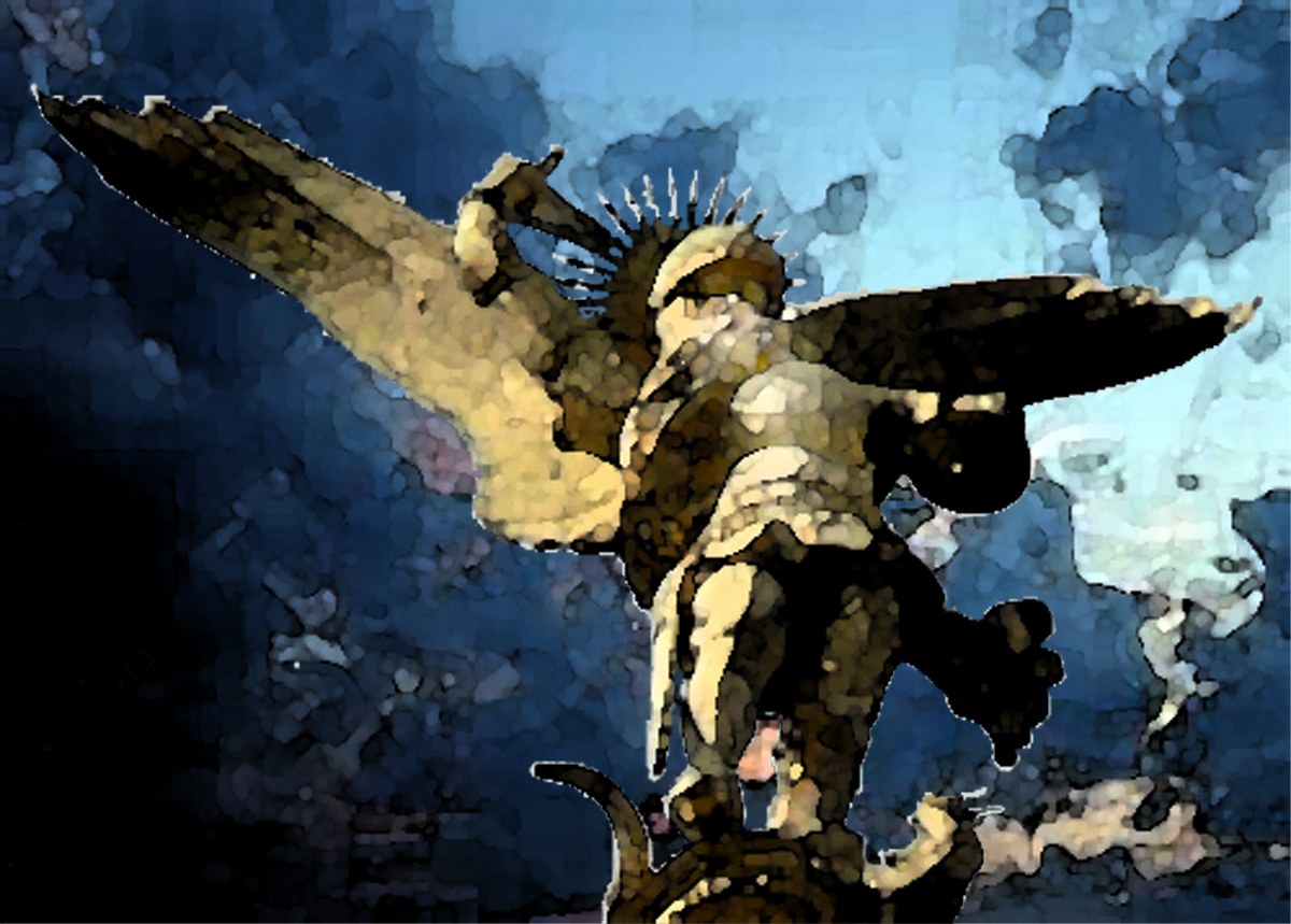 SHORT STORY #7 Chapter Heading Pic – The archangel Michael (and his nostril) surveying the world on a stormy, unhappy evening, from high above an uncomfortable, wind-beaten, slippery mountain of sea-engirdled rock, overhanging an equally uncomfortable rain-whipped surf – from the short story The Nostril of the Archangel.