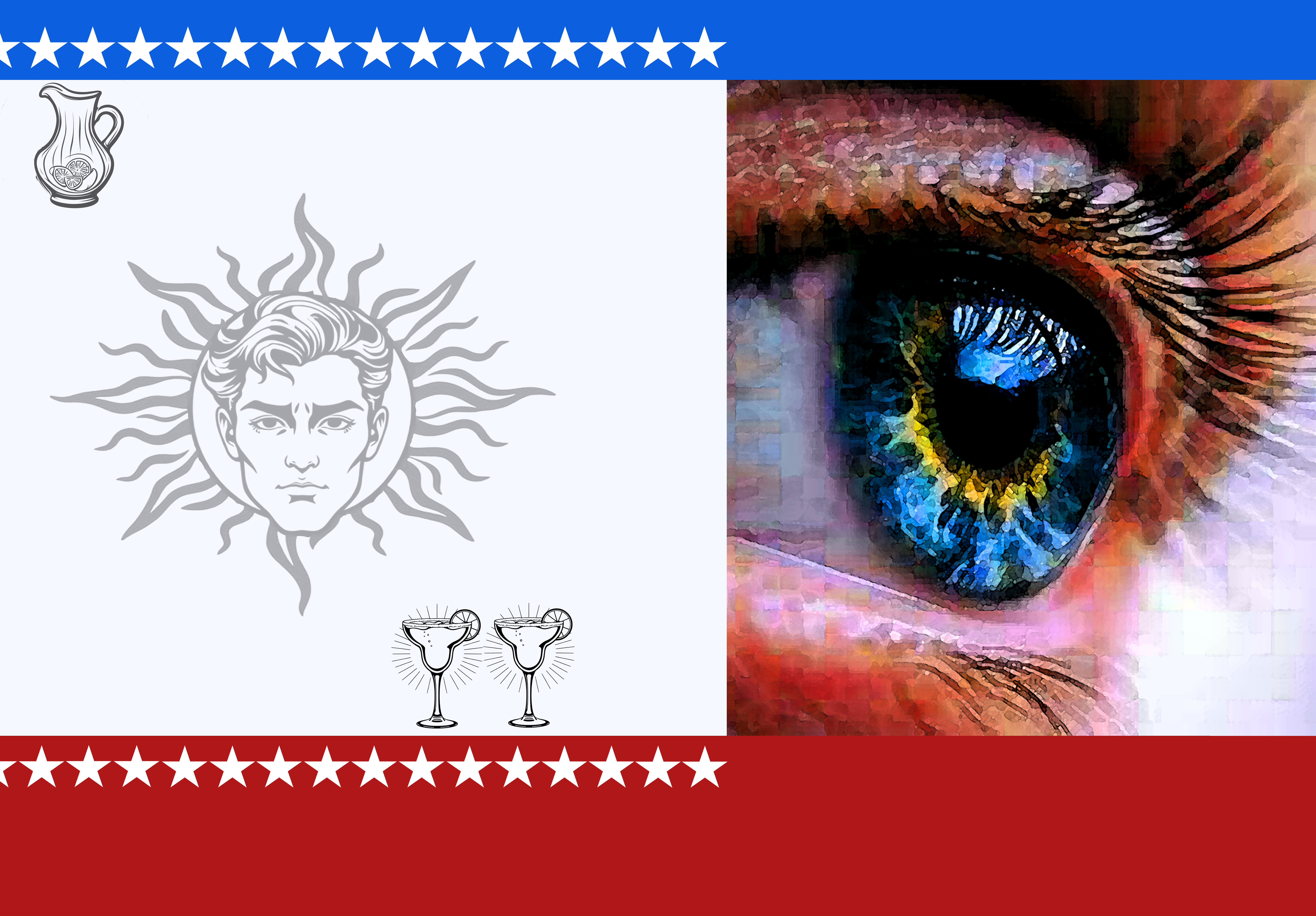 A young, gay, male Texan eye looking out in baffled incredulity at his life imploding before his very eye(s), a pitcher of margaritas and a couple of salt-encrusted, lime-bearing glasses, a burning man (not the Nevada kind), and various Texas/USA flag references all make up the cover art of this volume of Day Drinking at the Mall.